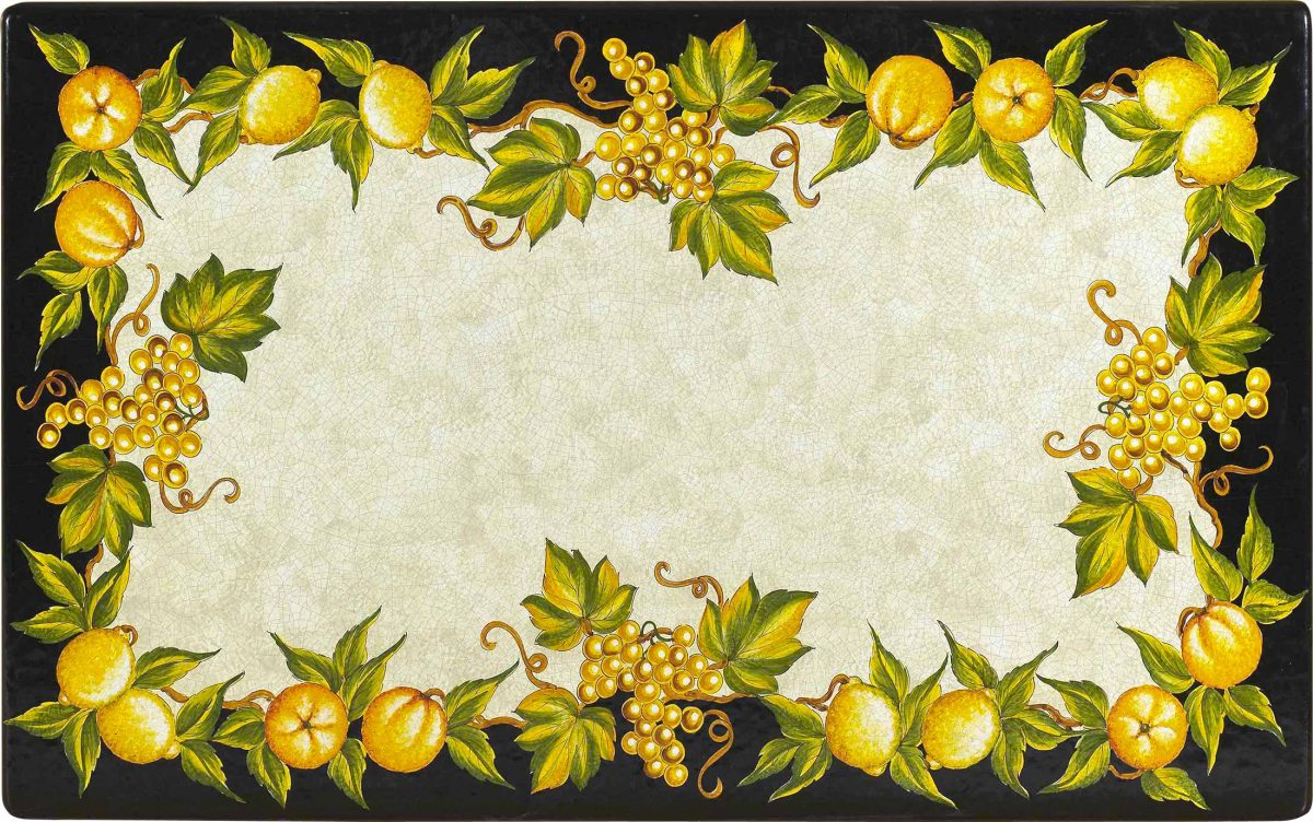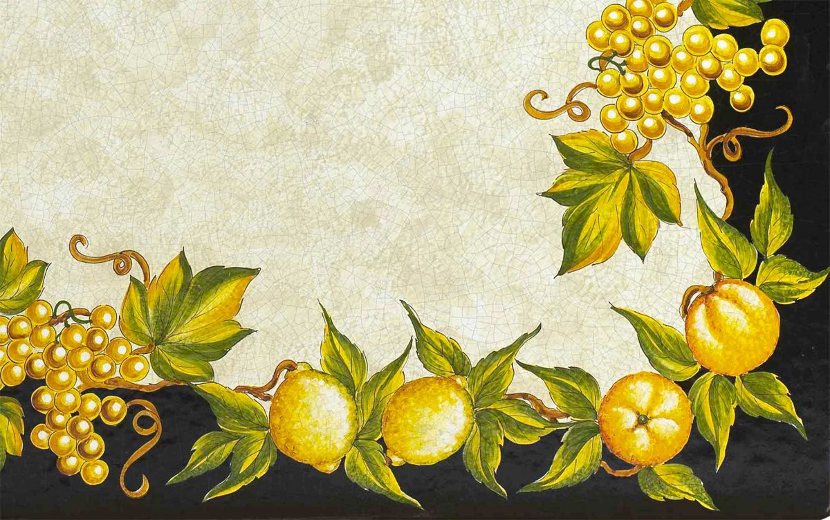 A triumph of lemons and grape bunches features in this decoration, permeated by the colour of the sun.