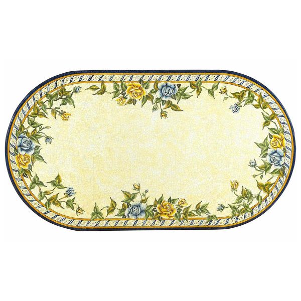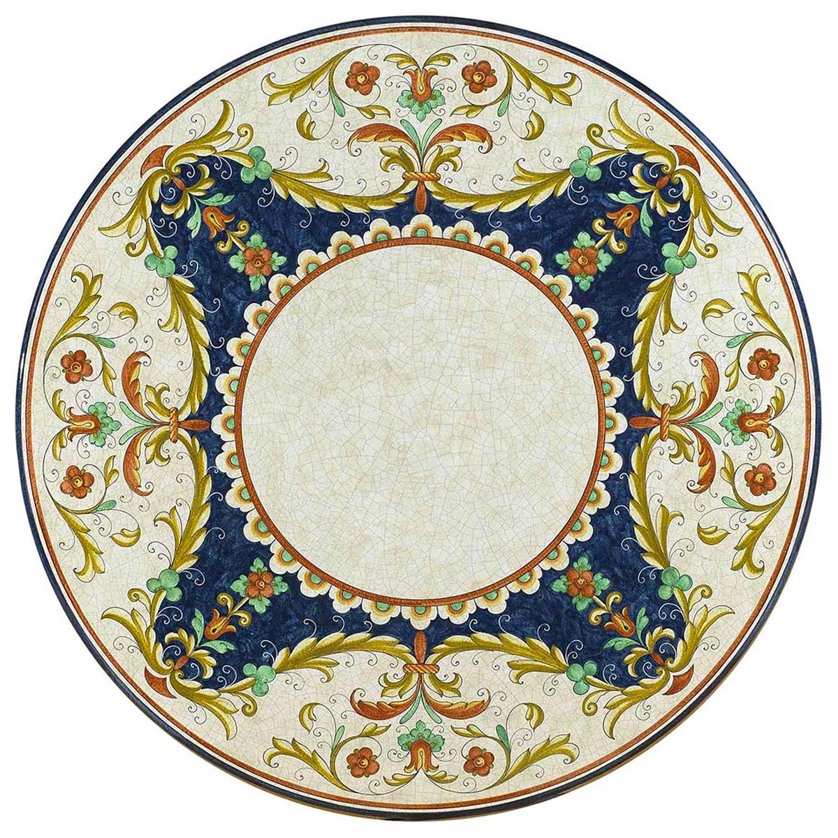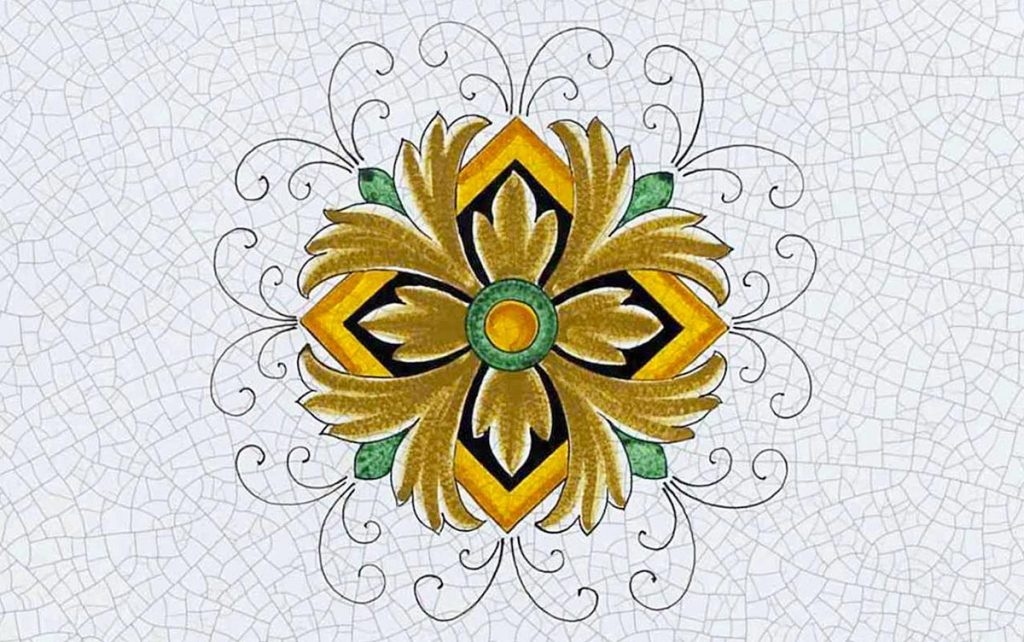 An extremely rich and high-impact decoration that develops in several parts: the crown of flowers on a light background, the square with the same flowers on a dark background, and the small frame of white flowers enclosing the central part. The overall harmony gives rise to an exceptionally pleasing effect.