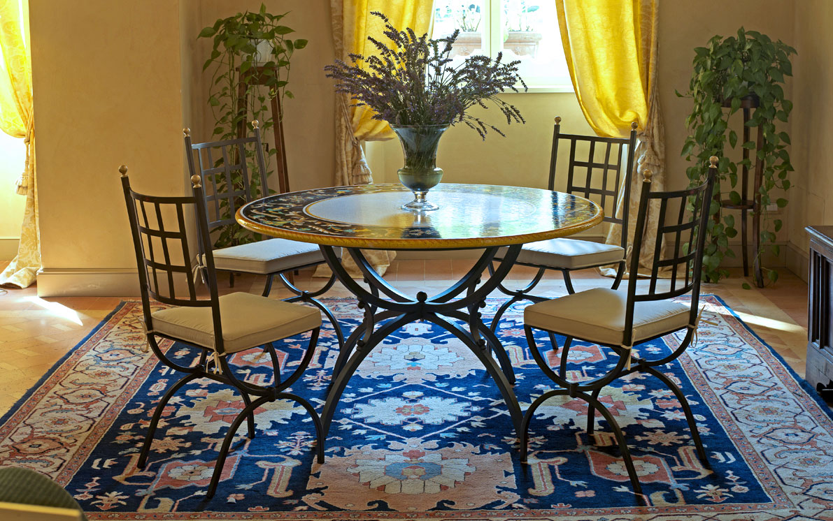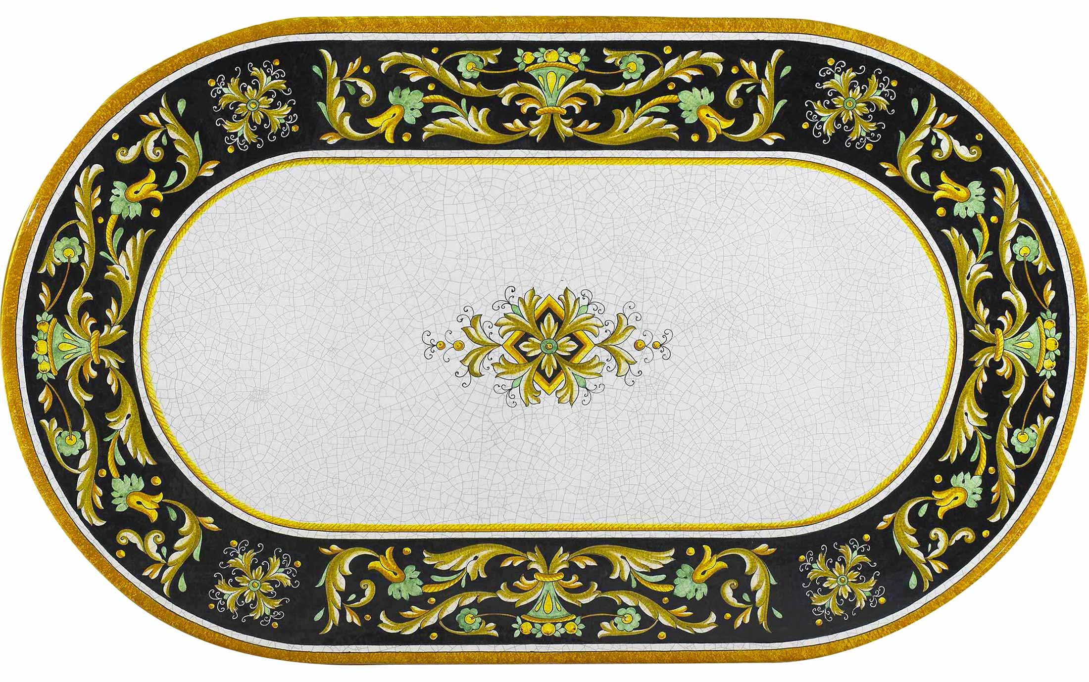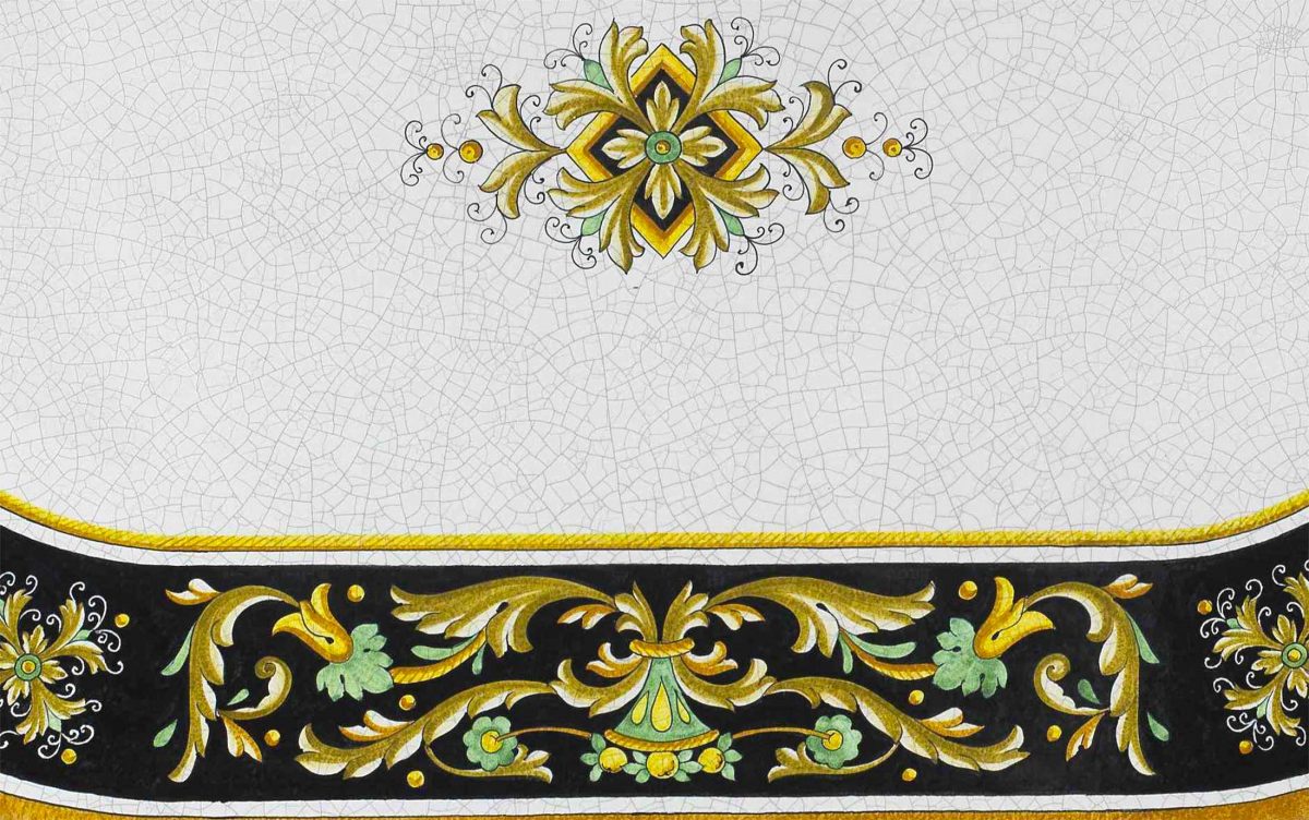 Great edging for a great effect. A highly refined and rich decoration, made with a significant harmony of colours, stands out against a dark background. A stylised flower in the centre, on a light background, alludes to the edge decoration.