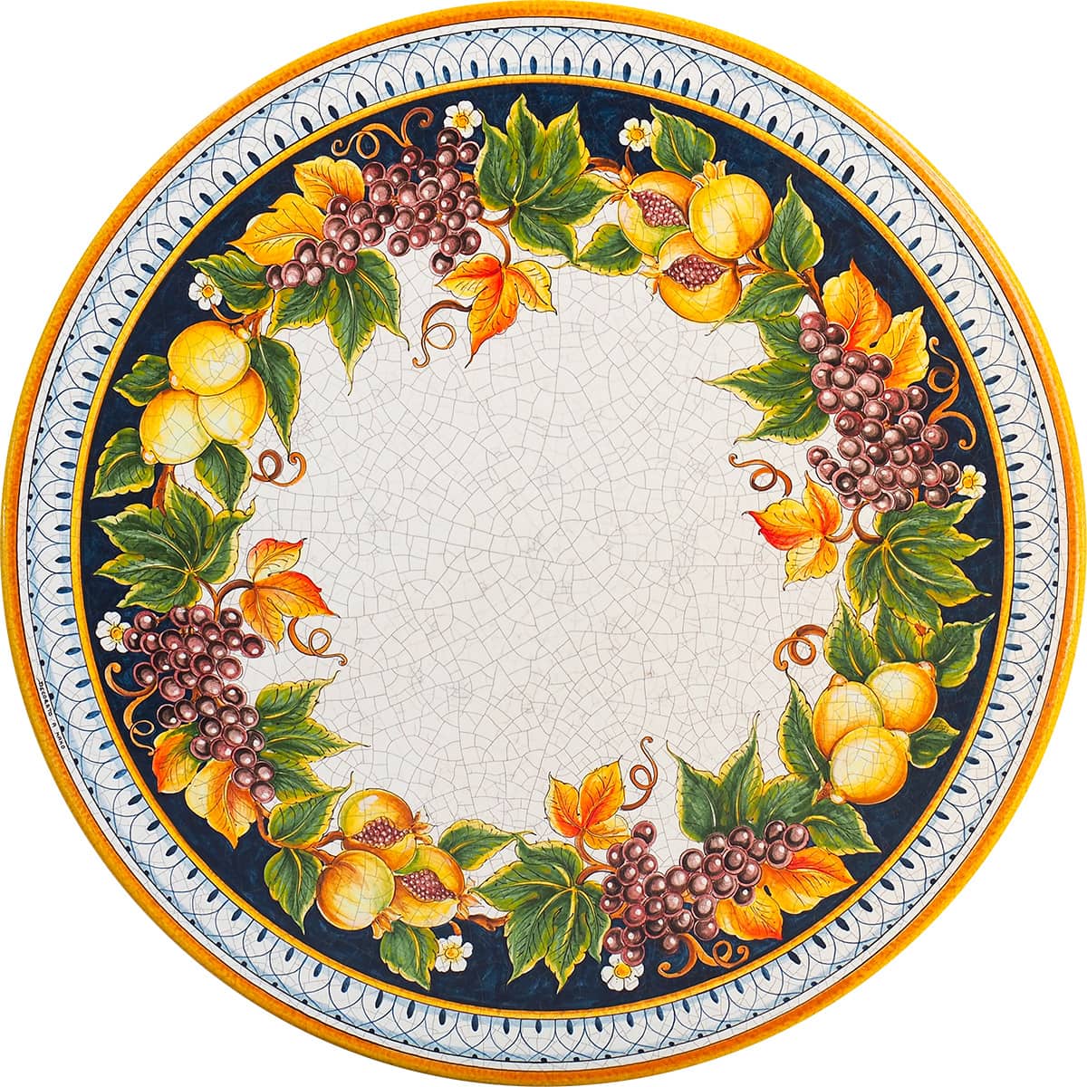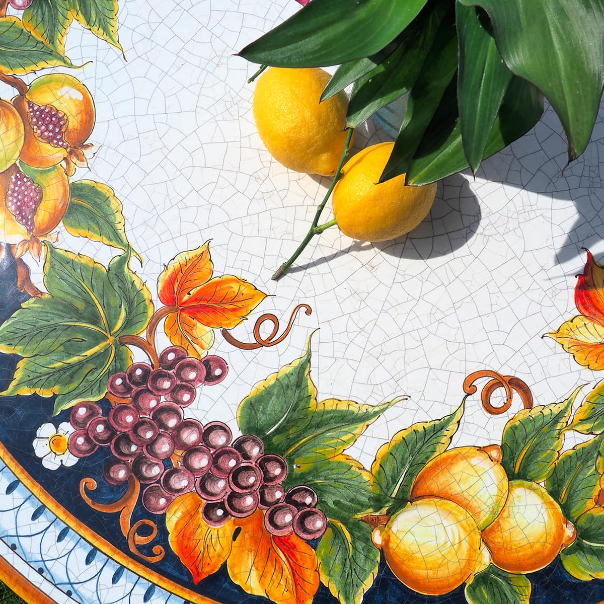 A table featuring an elegant geometric frame with entwined cusped arches. A fruit composition of lemons, pomegranates, grapes and lemons is captured on a generous blue background, bestowing a sea and sun effect on the entire ensemble.