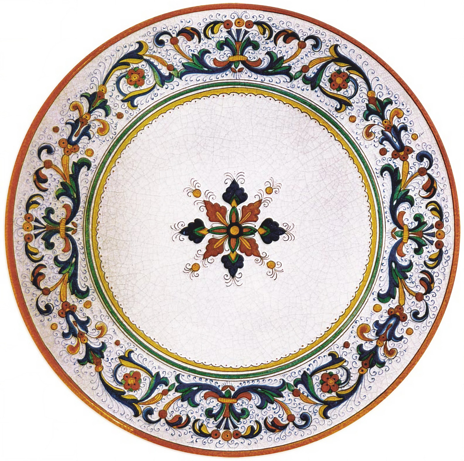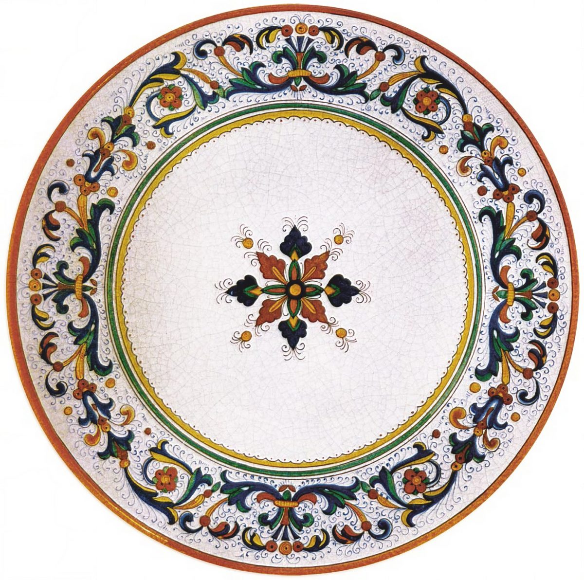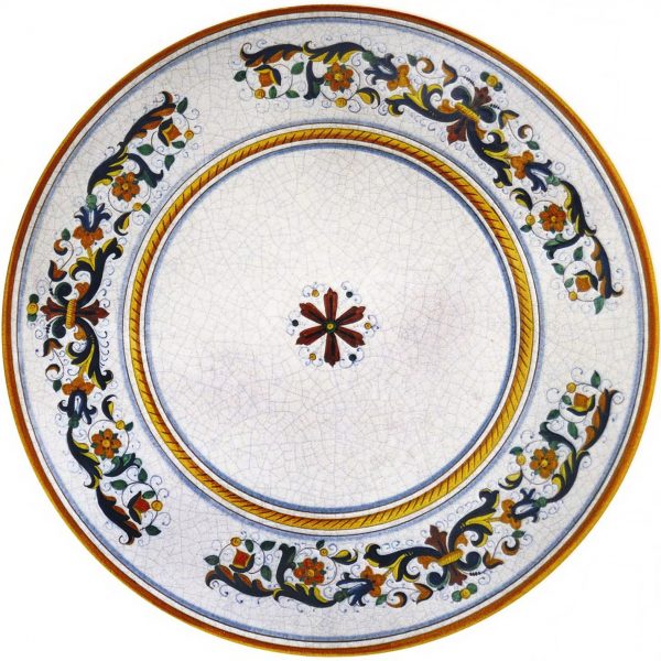 A rich decoration with the traditional colours of Deruta majolica and renaissance-style grotesques, an ample frame of grotesques enriched with volutes and floral elements, and a symmetrical decoration repeated in the centre.