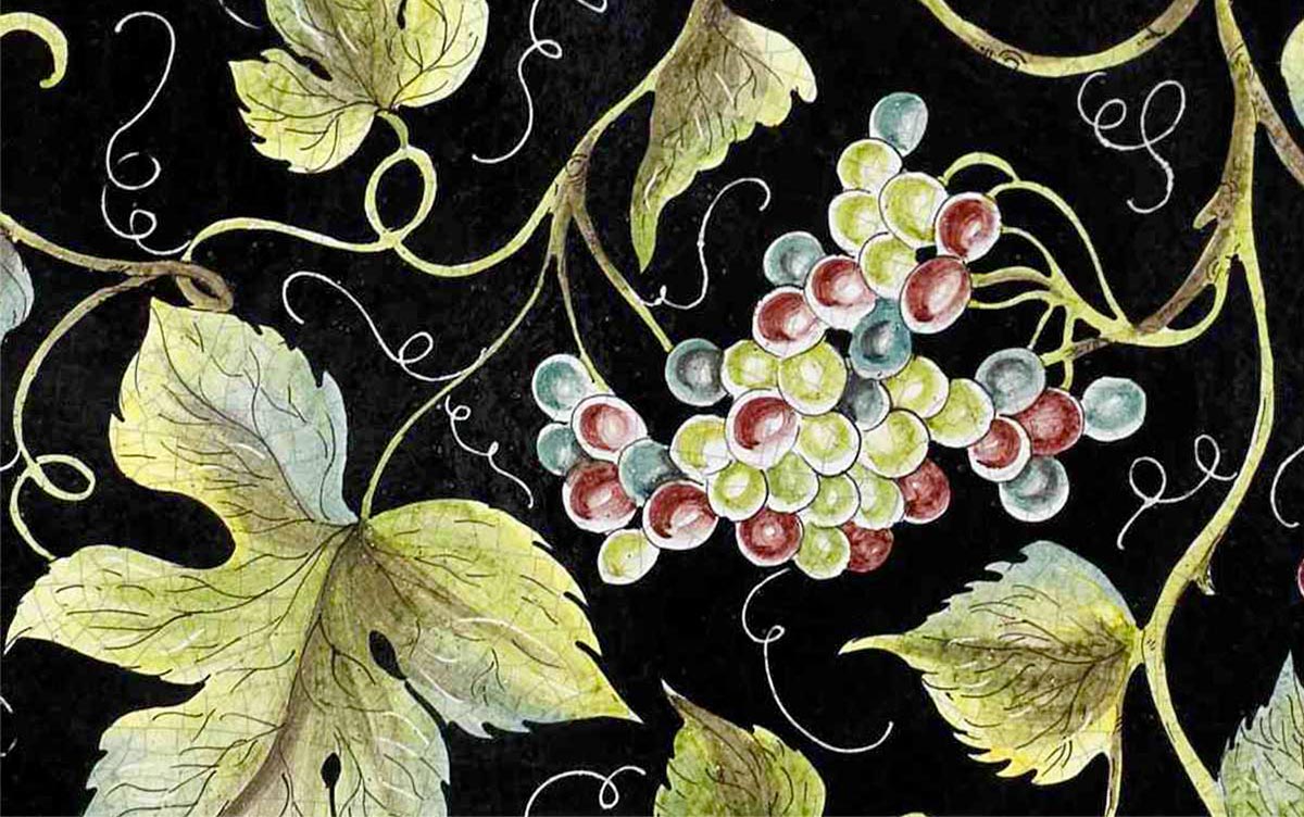 Wonderful vine shoots with colorful grape clusters stand out against a dark background. The overall effect is cheerful yet soft and delicate, creating a striking impression.