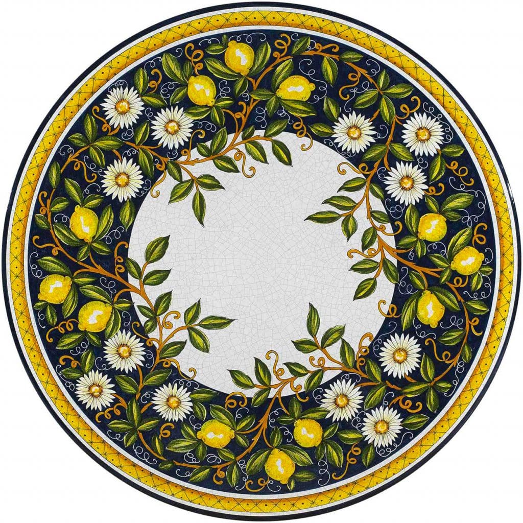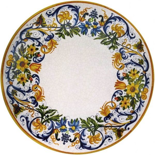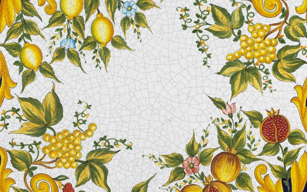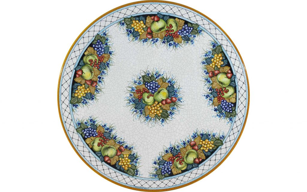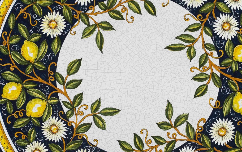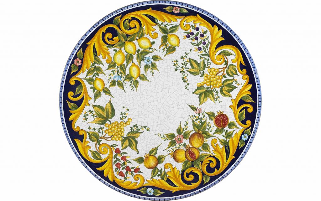• Materiale: ceramica di Deruta dipinta a mano su un biscotto di pietra vulcanica delle cave di Soriano del Cimino (VT).