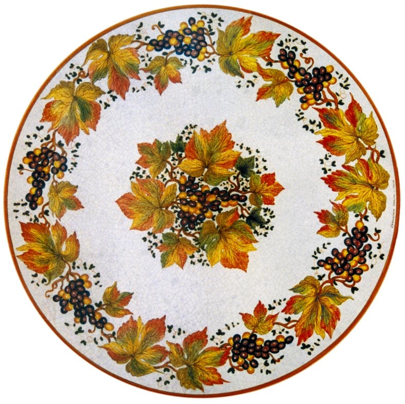 Dettagliato decoro dal sapore autunnale di vendemmia. I diversi toni delle fogli sembrano catturare l’inizio della stagione, quando il rosso del Sagrantino comincia a fare capolino sulla punta. Grappoli d’uva sono rappresentati ancora tra i tralci in diversi colori e sfumati con delicati effetti di illuminazione.