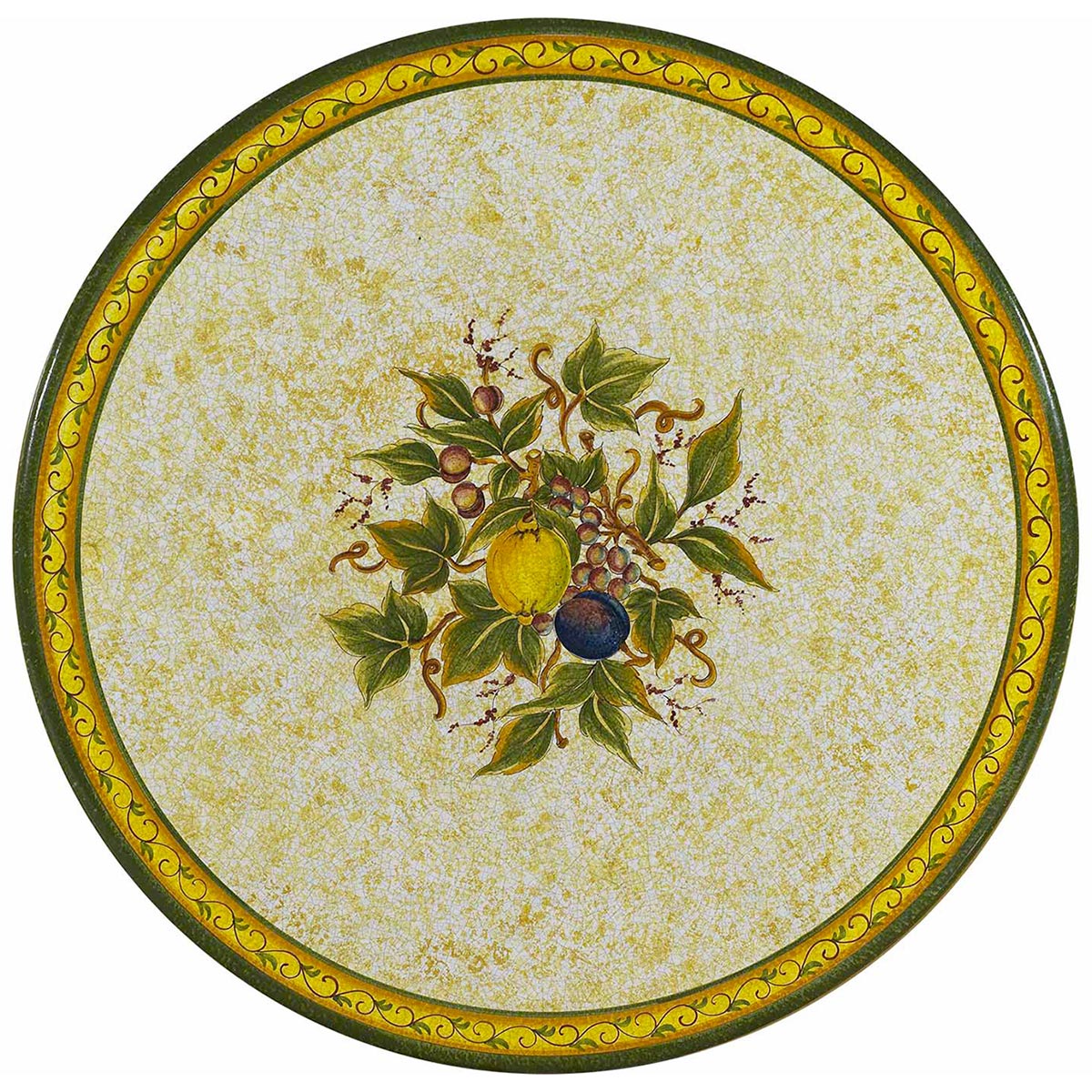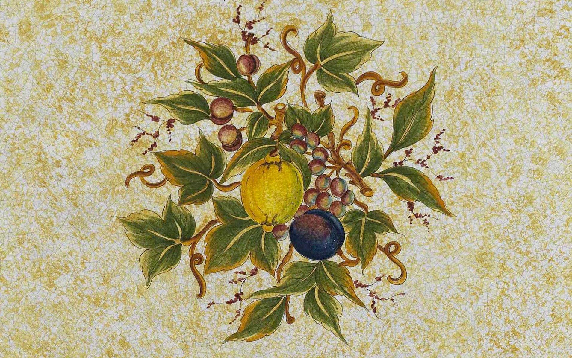 Un delicato ed elegante rametto di frutta domina questo decoro racchiuso in una raffinata cornice dai colori solari  che si accorda con lo sfondo