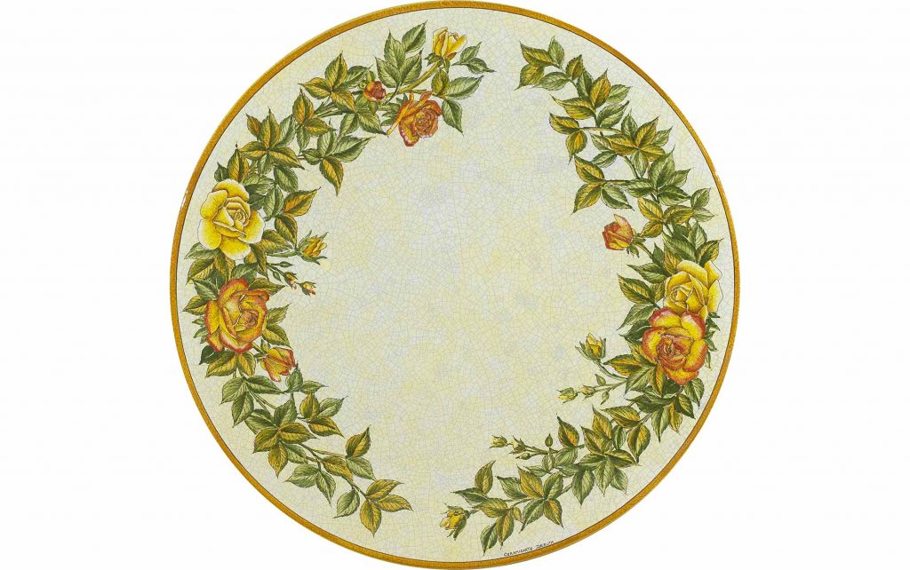 • Materiale: ceramica di Deruta dipinta a mano su un biscotto di pietra vulcanica delle cave di Soriano del Cimino (VT).