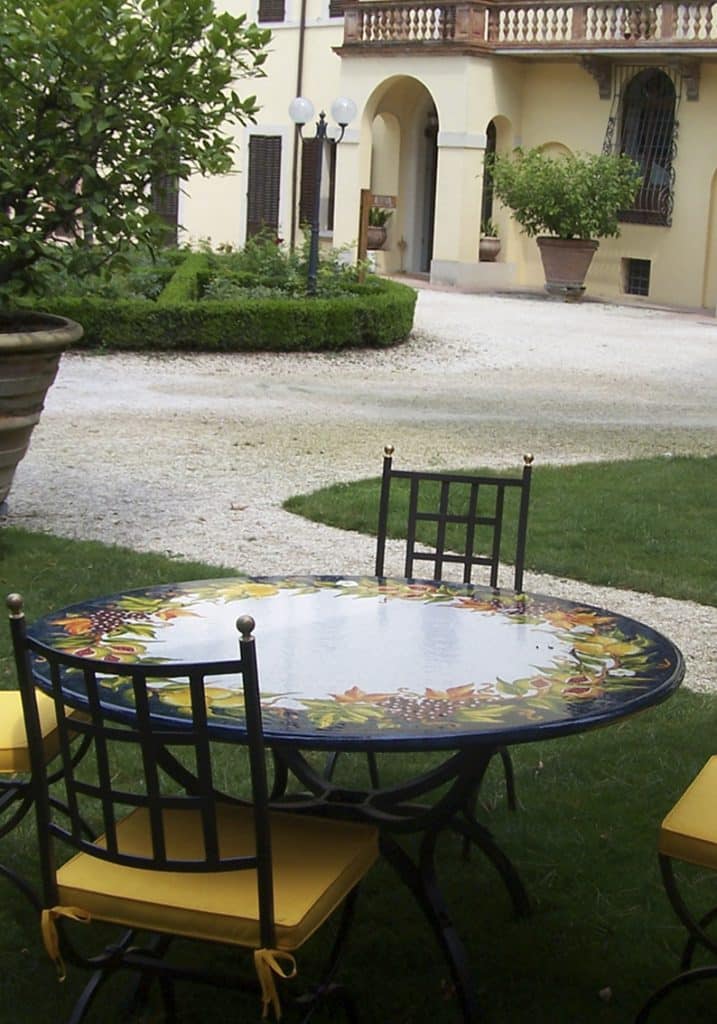 Una ricca composizione circolare adorna questo tavolo su smalto bianco. Un tripudio di frutti e fiori circondati da rami e tralci è rappresentato con particolare cura dei toni e chiaroscuri e attenzione ai dettagli con un effetto particolarmente realistico e tridimensionale.